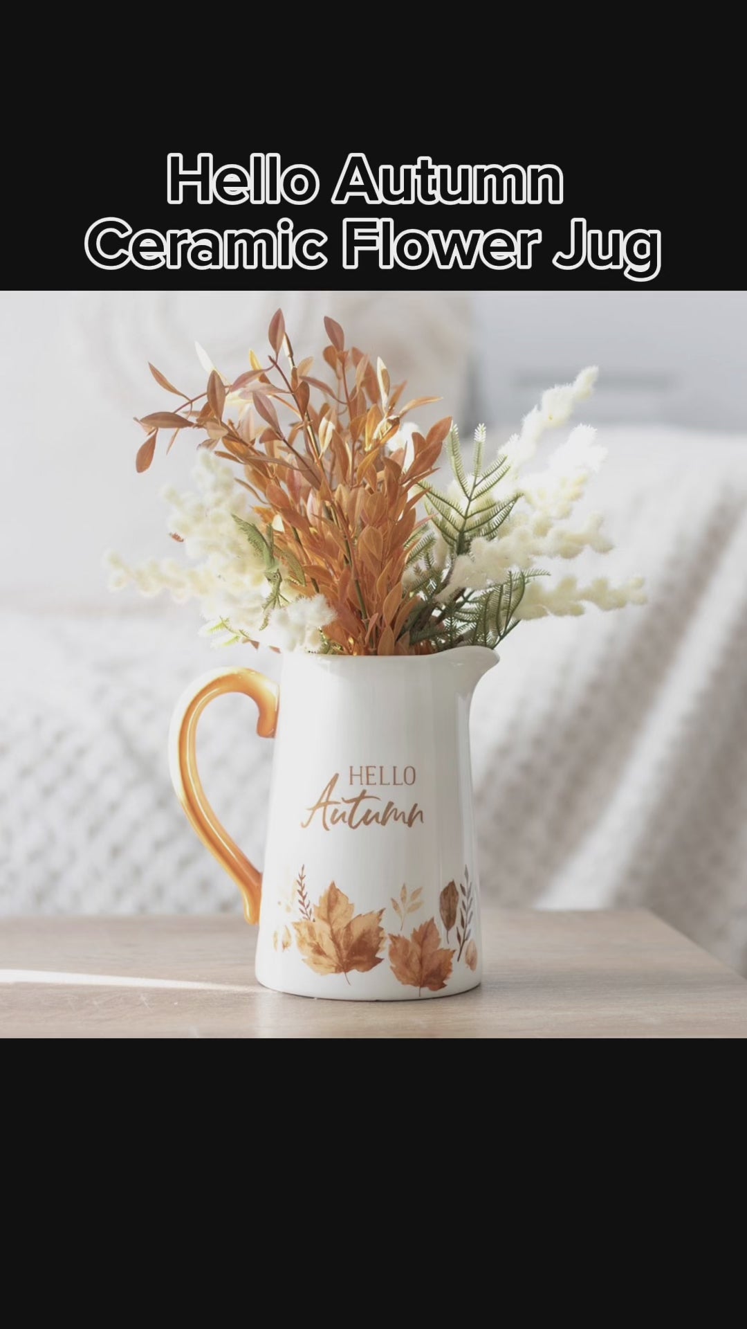 This white ceramic flower jug features a painterly leaf design accented by a contrasting handle, perfect for displaying autumnal blooms throughout the season. Not suitable for food or drink. Hand wash only. Do not microwave.