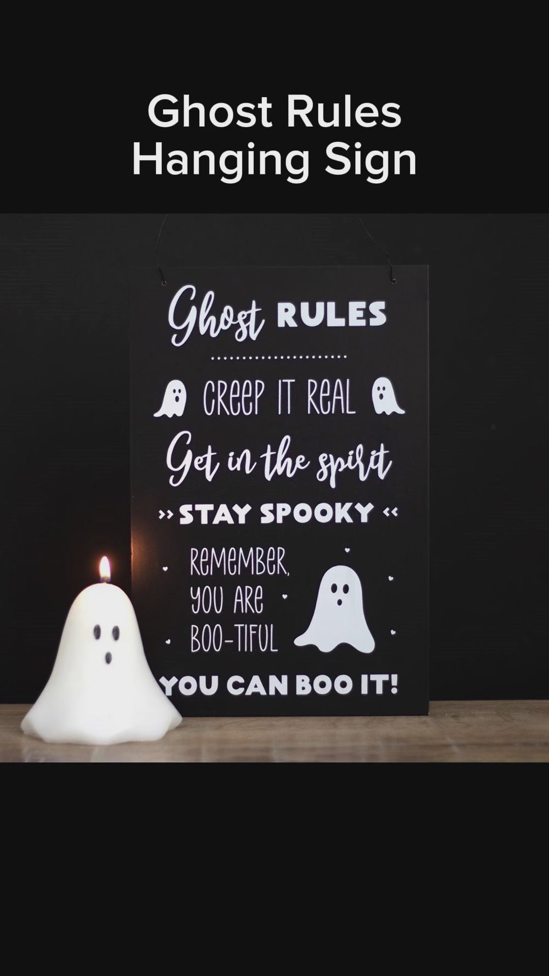 Get spooky this Halloween with a fun hanging sign perfect for ghosts of all sizes. Features 'Ghost Rules' and 'Creep it real. Get in the spirit. Stay spooky. Remember, you are boo-tiful. You can boo it!' text finished with three friendly ghost graphics.