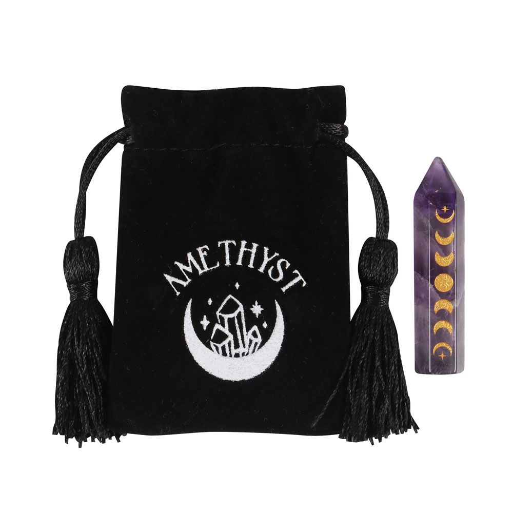 This beautiful amethyst crystal point is perfect in size for travel altars, desk décor or taking on the go for extra protection. Features a gold-tone moon phase engraving and comes with a matching drawstring bag for storage and safe-keeping.