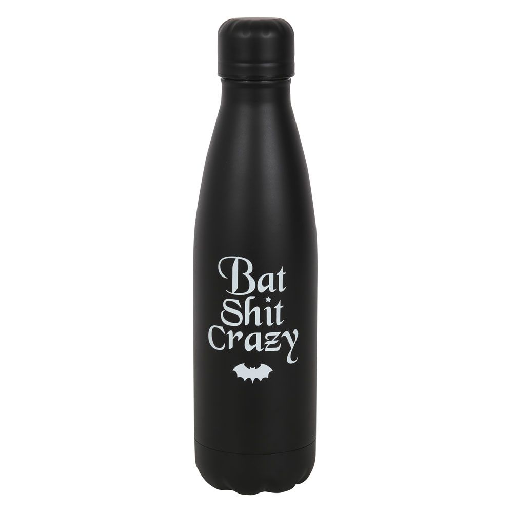 Even crazy, old bats need to keep hydrated! This black metal water bottle makes a great eco-friendly replacement for plastic and features funny 'Bat Shit Crazy' text. This item features a convenient screw-top lid to prevent accidental spills. 500ml capacity. Hand wash only. Do not microwave. Suitable for hot or cold beverages. BPA free.