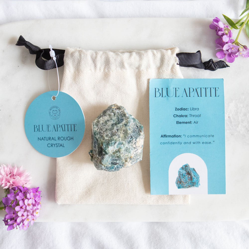 Blue apatite crystals are said to improve communication and are commonly used as an aid in crystal healing. Harness its rumoured healing properties to promote confidence and intellect. Comes in a cotton drawstring pouch with matching information card. Size, shape and colour of stone will vary due to its unique nature.