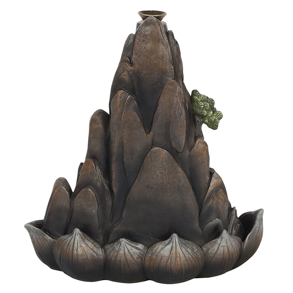 This resin backflow incense burner features a tall, rocky mountain cliff with Japanese bonsai trees beautifully accenting the side. To use, place a backflow cone on top and watch as the smoke gently flows down the mountainside and pools in the petal-shaped dish below.