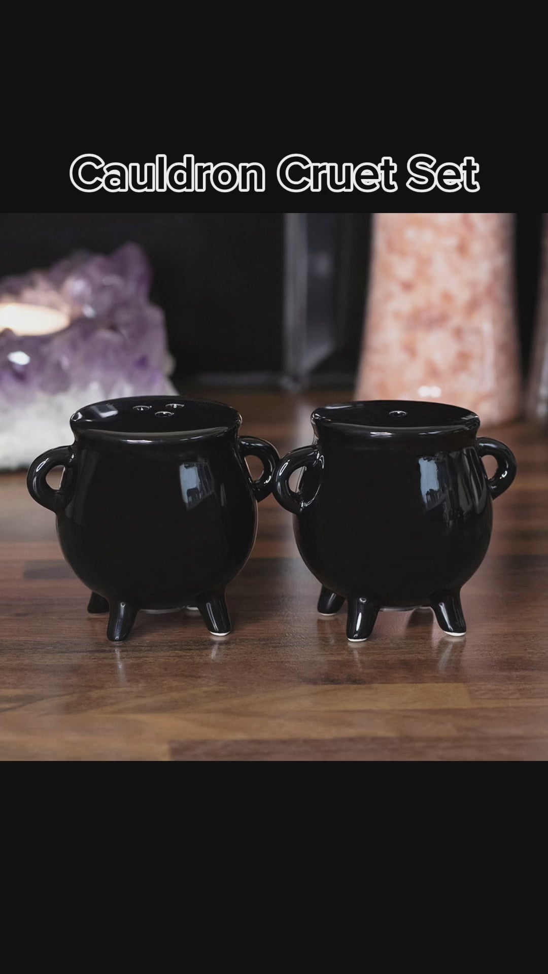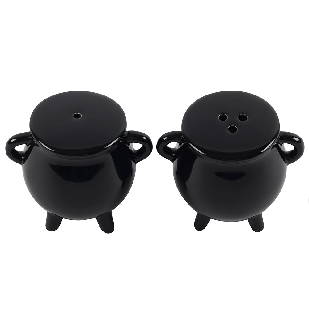 A fun miniature Cauldron Cruet Set. Made with a rubber bottom stopper to keep salt and pepper contained. Do not microwave. Dishwasher safe.