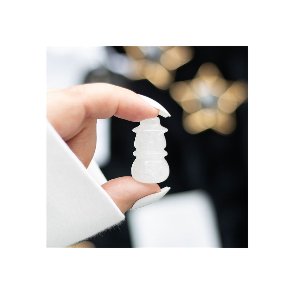 Add a touch of festive magic with this clear quartz crystal snowman in a bag. Hand-carved into an adorable snowman, this gemstone is crafted from clear quartz for attracting positive energy and balance, and for amplifying festive spirits throughout the season. Perfect for decorating or gifting, this unique crystal is kept safely in a matching velvet drawstring bag. As each crystal is unique, stone shape and colour may vary from photos shown.
