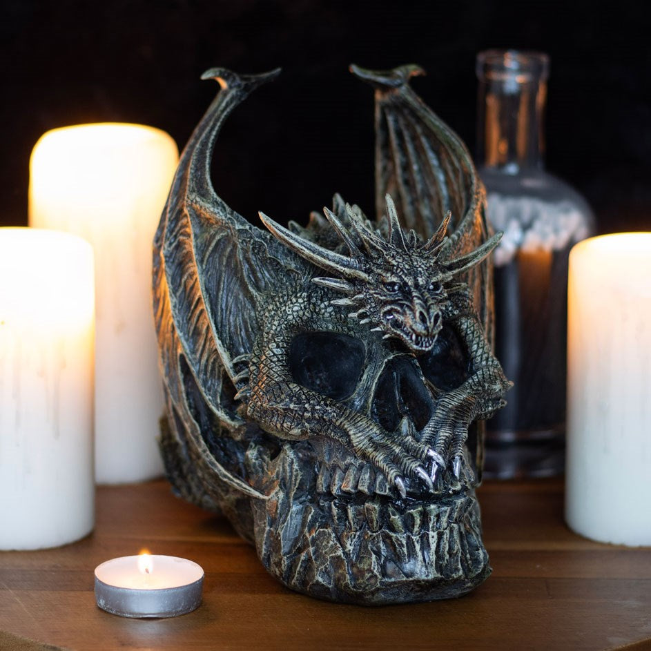 This magnificent Draco Dragon skull ornament licensed by Spiral Direct Ltd is incredibly detailed and features a vengeful dragon sprawling over the top of a skull with its long winged arms draped around the eyes and claws delicately placed above the mouth. Measuring 7.5 inches in height this collectable item is crafted from high-quality resin and is an ideal gift for any dragon enthusiast.