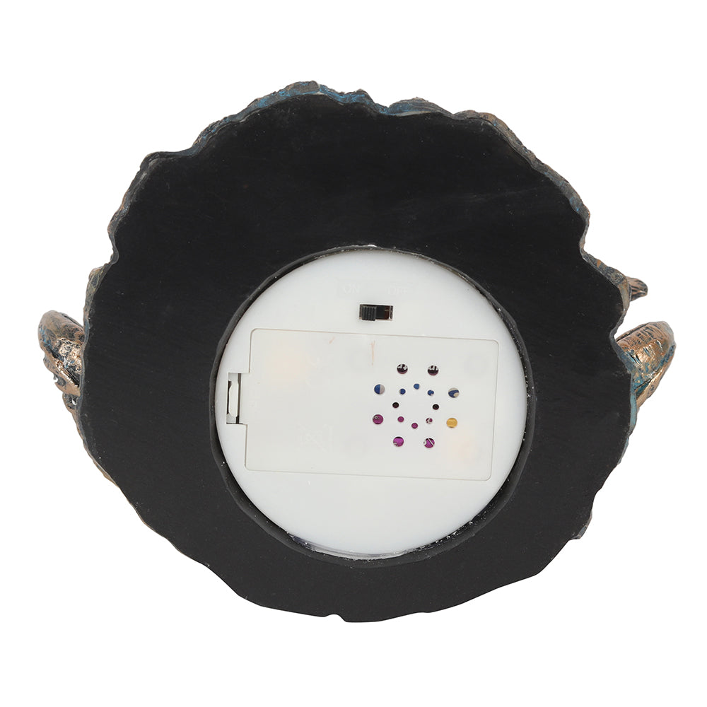Baphomet, the occult deity commonly portrayed by a winged half-human, half-goat figure, sits atop a horned skull on this amazing backflow incense burner. While adopted as an icon of the Church of Satan, Baphomet originated as a symbol of contrast and balance by the Knights Templar. To use, simply add a backflow incense cone to Baphomet's lap and watch as the smoke emerges from the skull's lit eyes. Bottom on/off switch. 2 AA batteries required. Not included with the product.