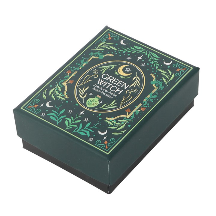This mystical necklace features a plastic potion bottle pendant filled with green aventurine chips, known for encouraging growth, prosperity, and heart-healing energy. A thoughtful gift or personal talisman for nature-loving spellcasters. May contain traces of nickel and is made from alloy in accordance to REACH specification.