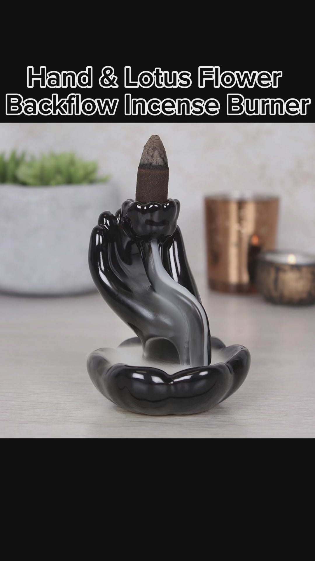 This black ceramic backflow burner is sculpted to show a hand holding a lotus flower. Place a lit backflow cone on top of the flower and watch as the smoke curls downward around the hand and wrist.