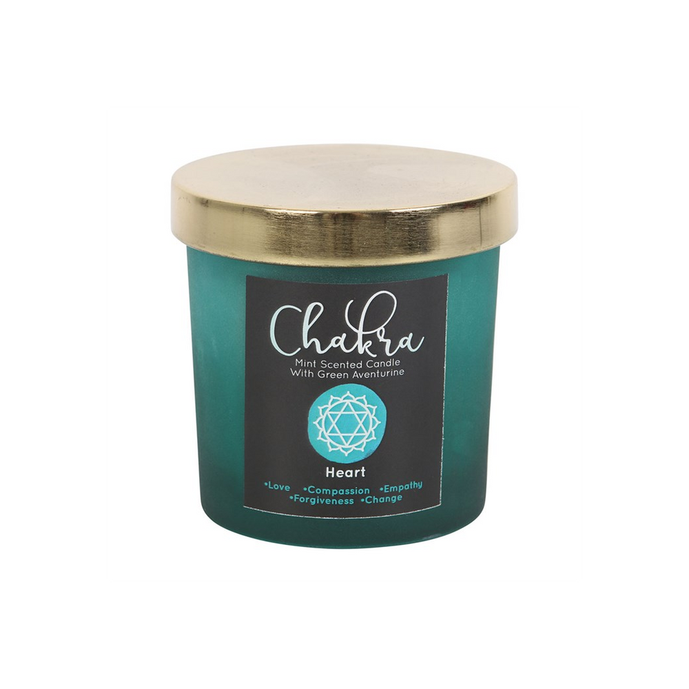 Realign the Heart chakra with this stunning Mint fragranced candle. A green frosted glass holder and metallic lid are accented by a scattering of green aventurine crystal chips that can later be reused for a multitude of spiritual purposes. Paraffin wax. Approximate burn time of 25 hours. Please practice caution when burning and never leave lit candle unattended.