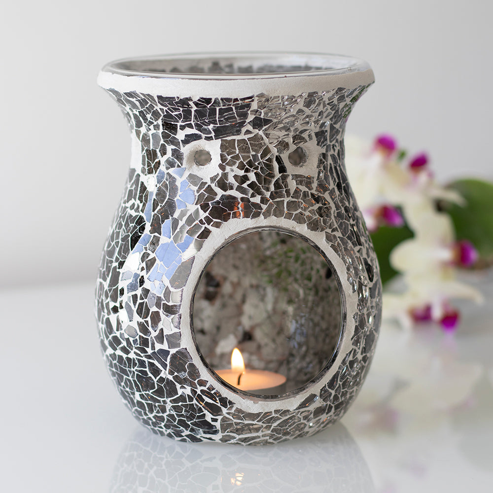 Beautiful large oil burner with a grey mirrored crackle effect. May also be used as a wax melt burner.