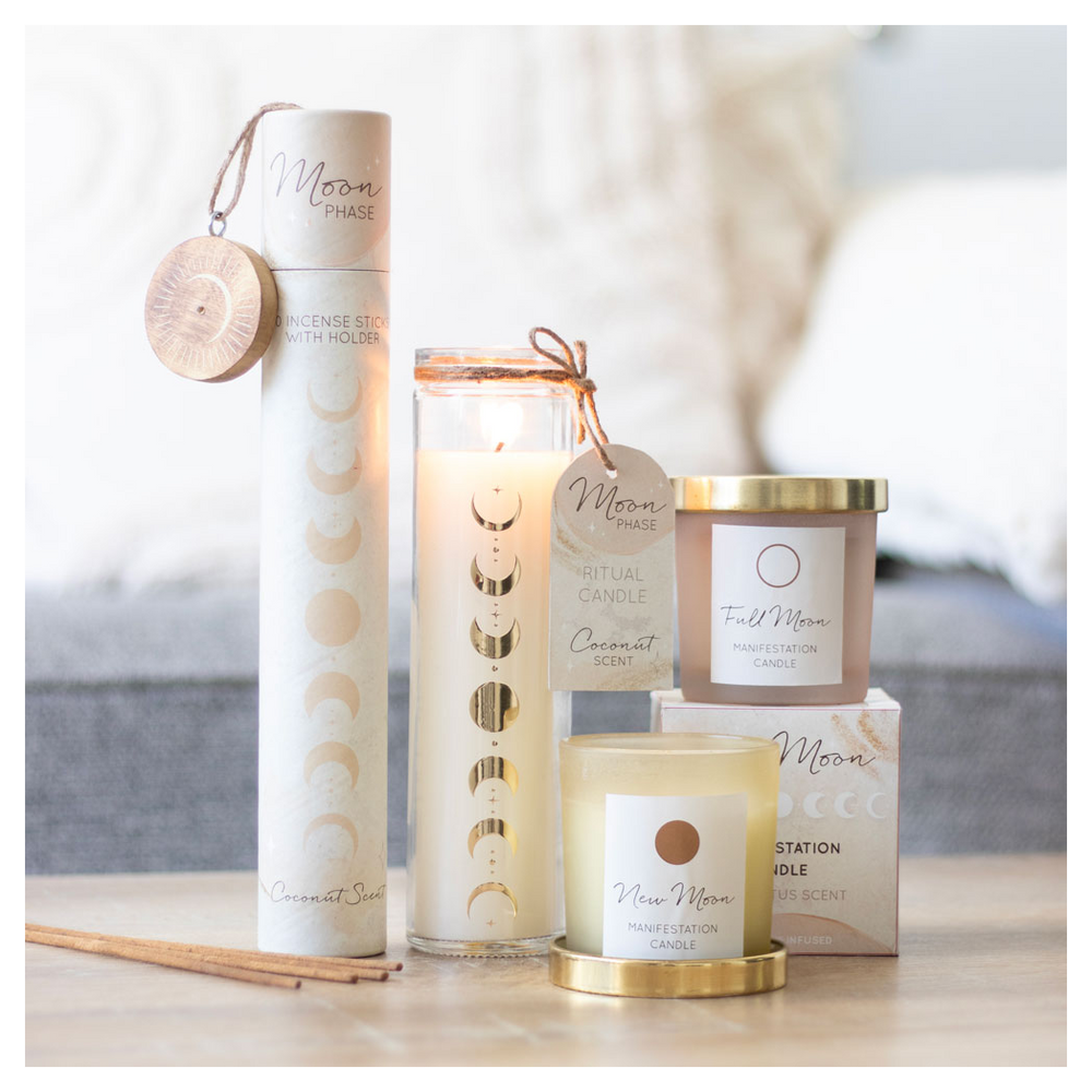 Inspired by traditional 7 day prayer candles, this moon phase tube candle comes in a lovely coconut fragrance and is perfect for relaxing in the home or manifesting under the moonlight. Paraffin wax. Approximate burn time of 70 hours