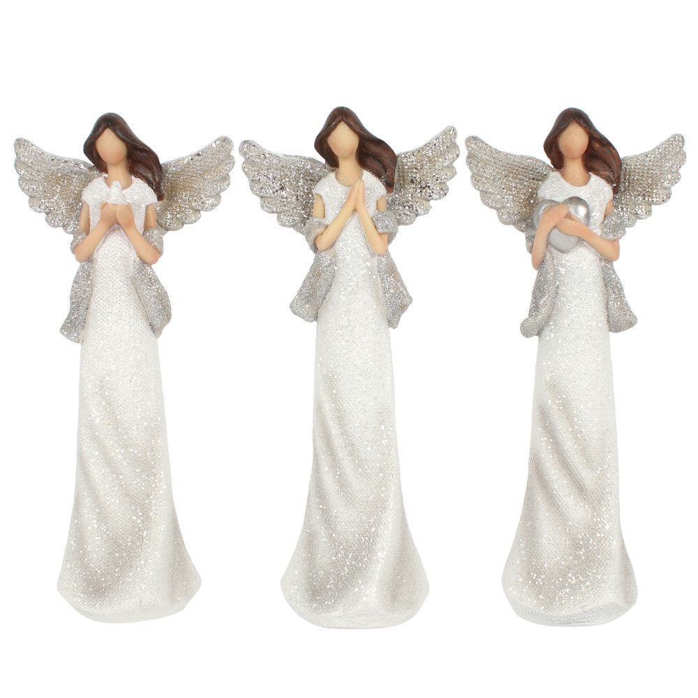 Beautiful trio of medium sized angel ornaments with a subtle glitter and metallic silver finish. The first angel holds a white dove to symbolise peace, the second holds her hands in a praying position and the third holds a silver heart to represent love.