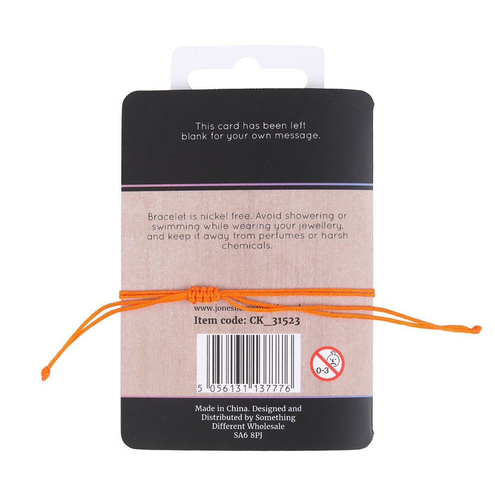 Balance and realign the sacral chakra with this orange string and metal charm bracelet. Presented on a matching backing card that reads, 'Creativity, sexuality, feelings, emotions, pleasure'.
