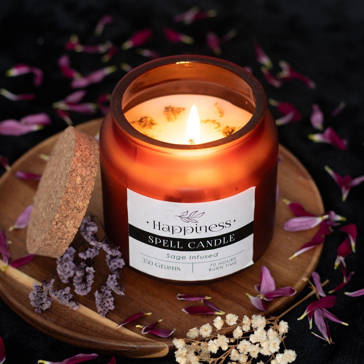 Happiness depends upon ourselves. Attract happiness, positivity and contentment with this beautiful spell jar candle. Candle magic is one of the simplest forms of manifestation in which you decide on a goal, light the candle, visualise the end result and focus intent to manifest that result. Infused with the cleansing aroma of sage to bring forth clarity and banish negativity. Beautifully packaged in a frosted glass jar with a cork lid, this candle will attract all things divine whether used as decor or as a ritual tool. This candle has the approx. burn time of 25 hours to fill your space with spellbinding fragrance.