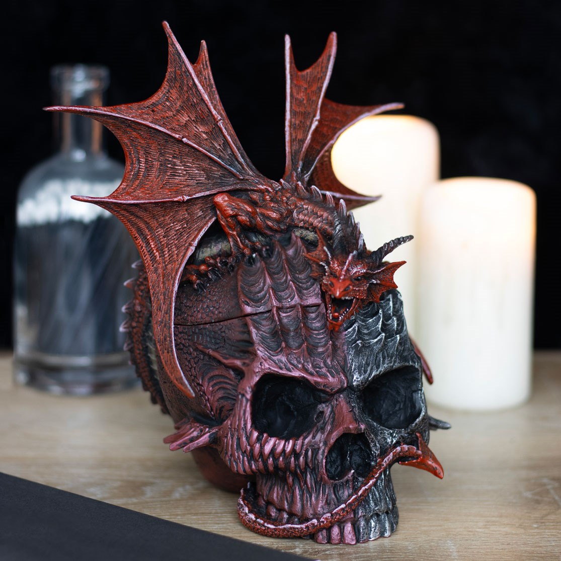 This magnificent Serpent Infection skull ornament licensed by Spiral Direct Ltd is incredibly detailed and features a vengeful blood red dragon sprawling over the top of a skull with its long spiked tail wrapped around the back until it rests gently across the top of the mouth. Measuring 8.5 inches in height this collectable item is crafted from high-quality resin and is an ideal gift for any dragon enthusiast.