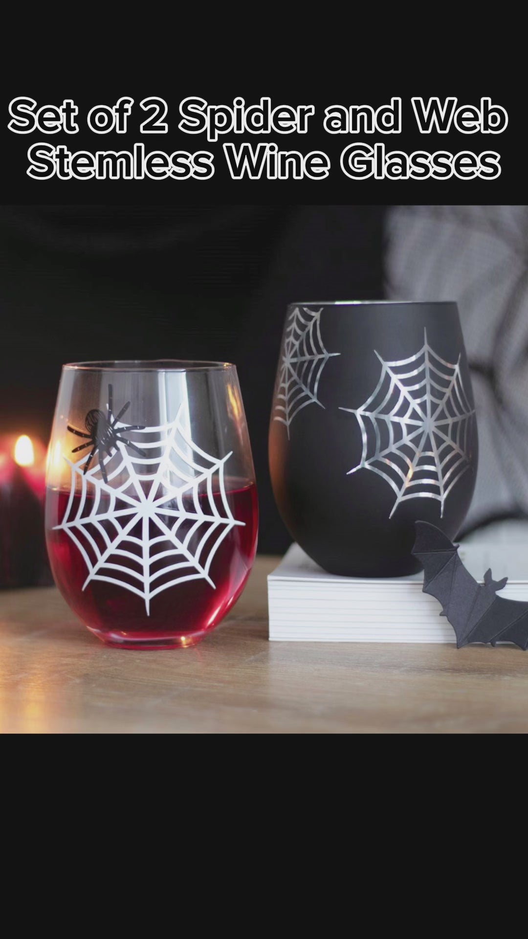 Have your wine and drink it, too! This set of 2 stemless glasses is perfect for nights of mischief. Designs feature a printed spider and his web (clear glass) and an eye-catching web silhouette with a silver interior (black). 500ml capacity each. Hand wash only. Do not microwave.