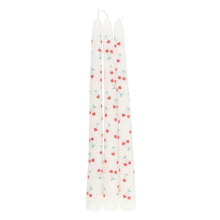 This pack of 3 white taper candles are perfect for adding final finishing touches to a table setting or adding decorative accents around the home. Featuring an adorable cherry heart design, the candles are an ideal gift for Valentine's Day. Made of paraffin wax with an approx burn time of 5 hours. Never leave a burning candle unattended and never allow the candle to burn all the way down to the base.