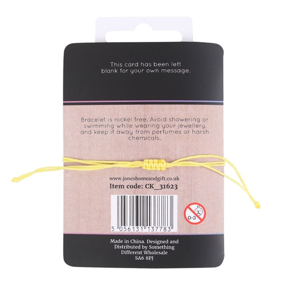 Balance and realign the solar plexus chakra with this yellow string and metal charm bracelet. Presented on a matching backing card that reads, 'Willpower, self-esteem, intellect, independence, responsibility'.