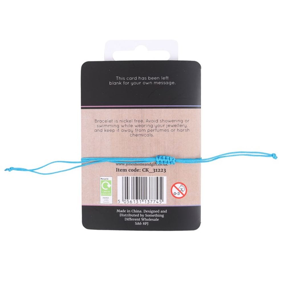 Balance and realign the throat chakra with this blue string and metal charm bracelet. Presented on a matching backing card that reads, 'Communication, expression, clarity, truth, purpose'.