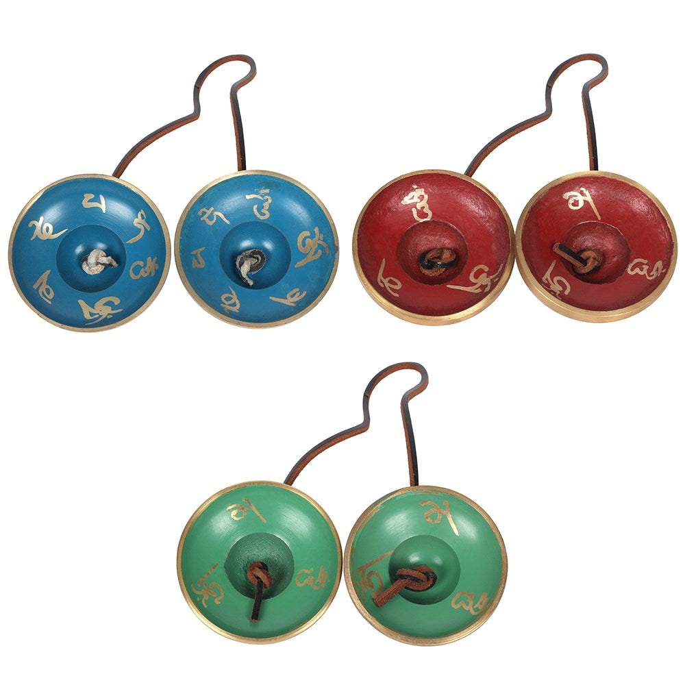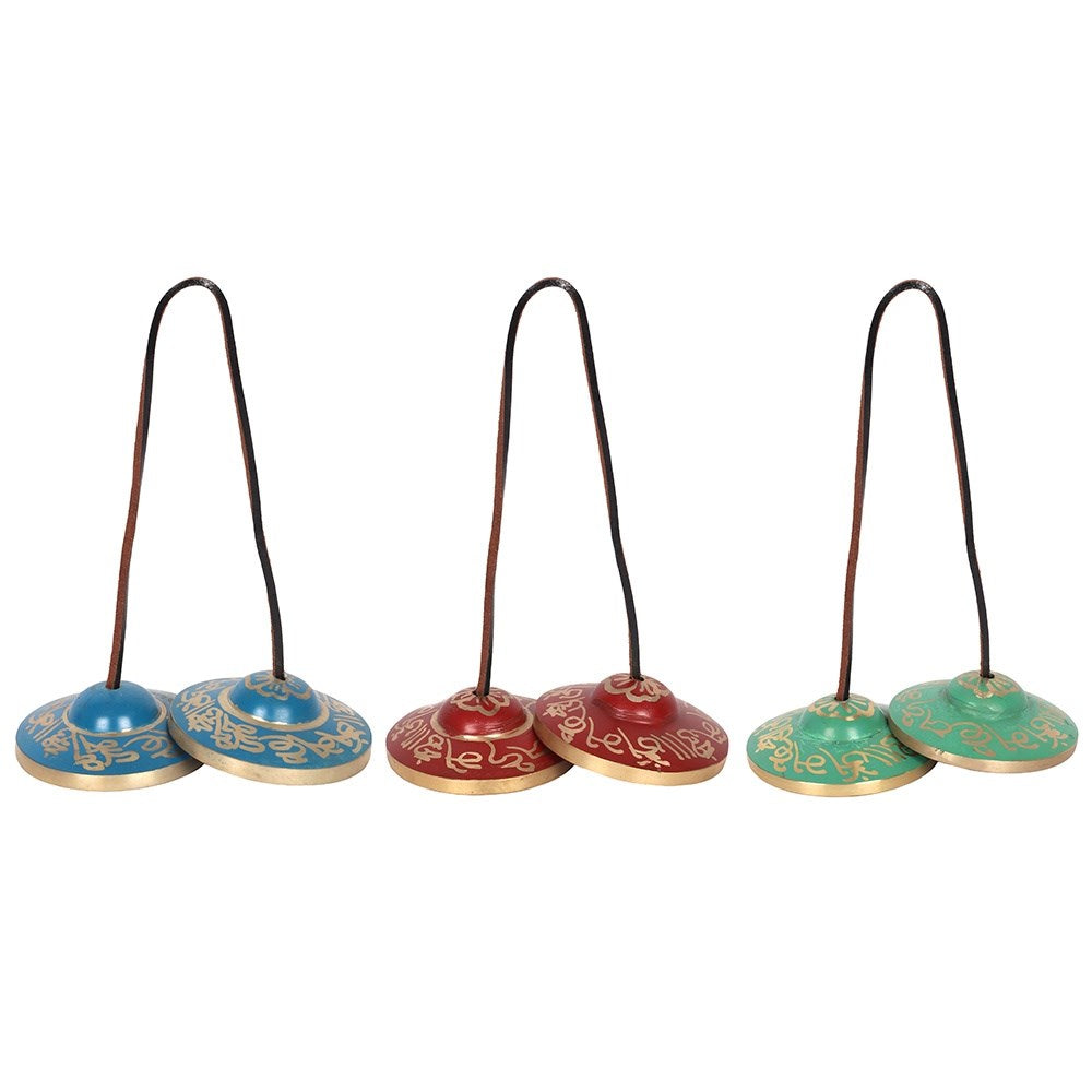Pair of traditional style Tibetan tingsas in a material pouch bag. Please note that colours and patterns of the Tingshas may vary.