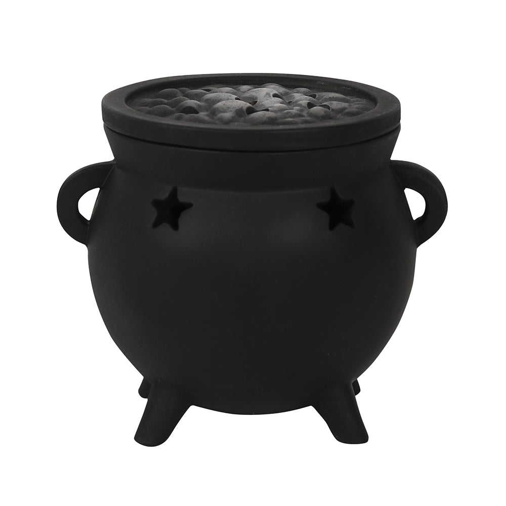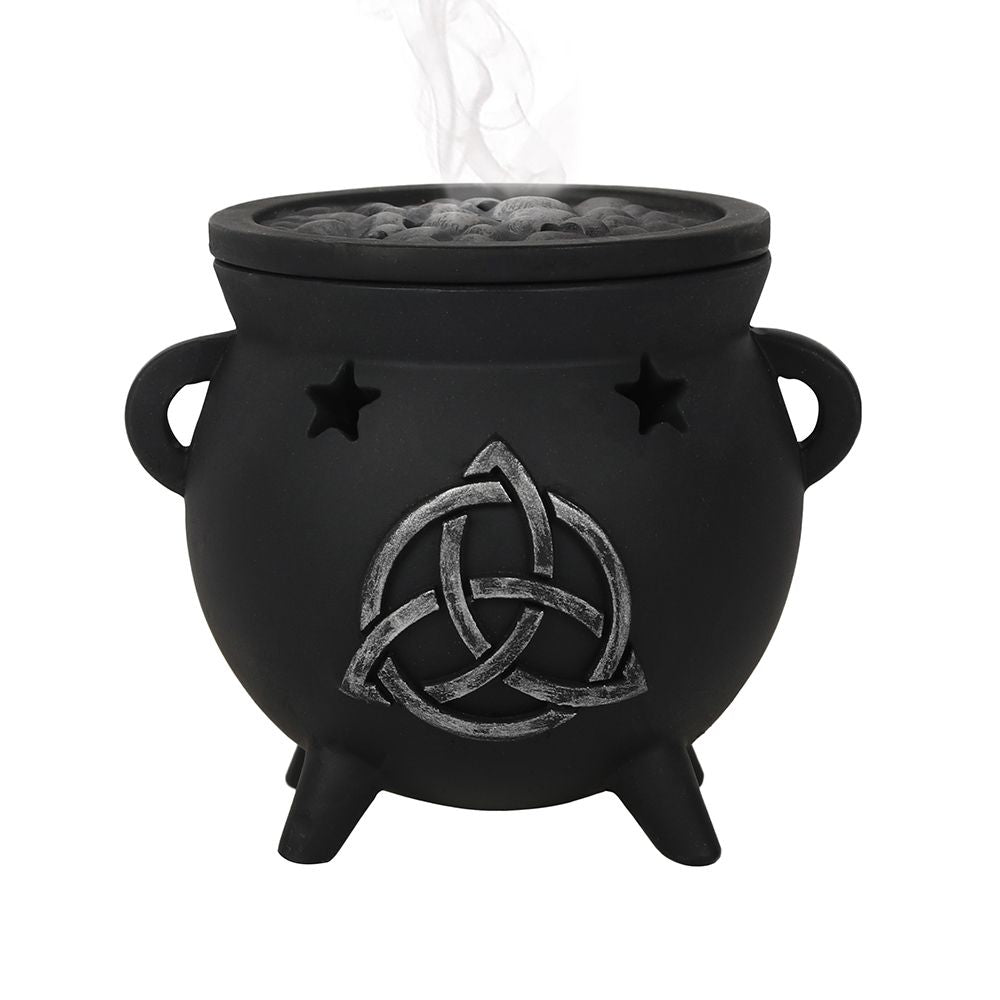 Place an incense cone inside of this resin triquetra cauldron burner and watch the smoke gently rise from the top. Accented by cut out stars and a triquetra design with a removable 'bubbling' brew top.4